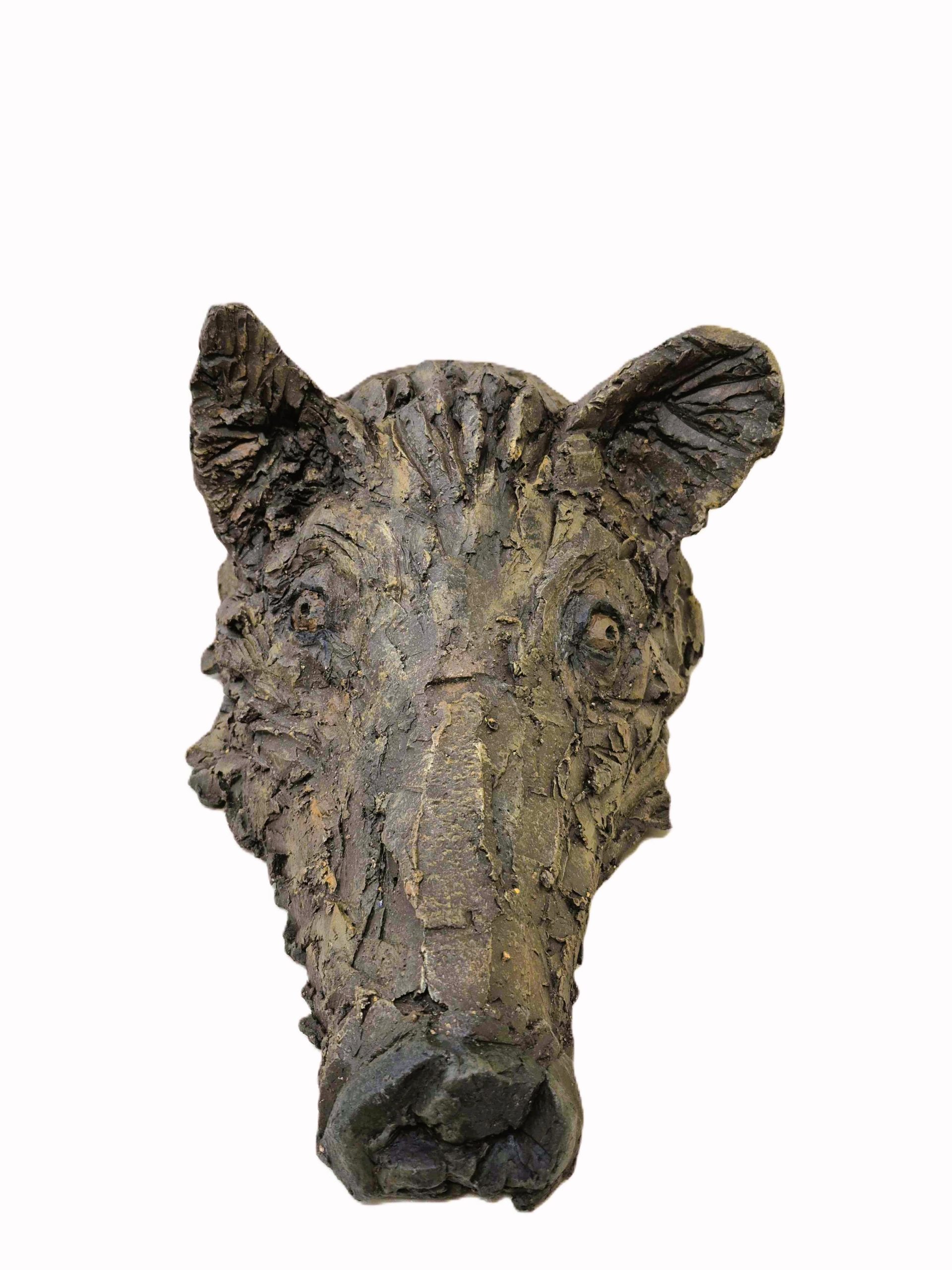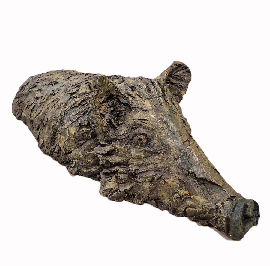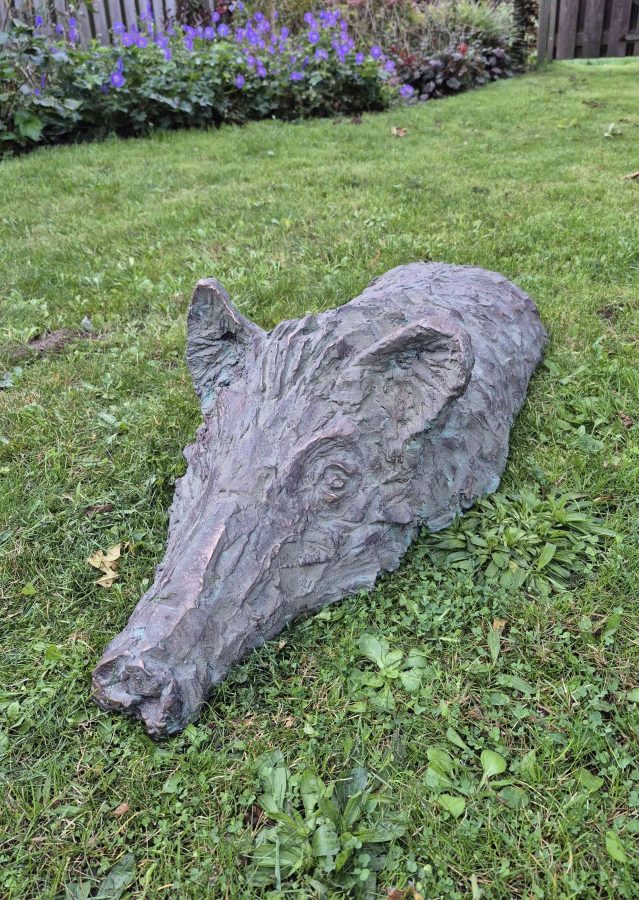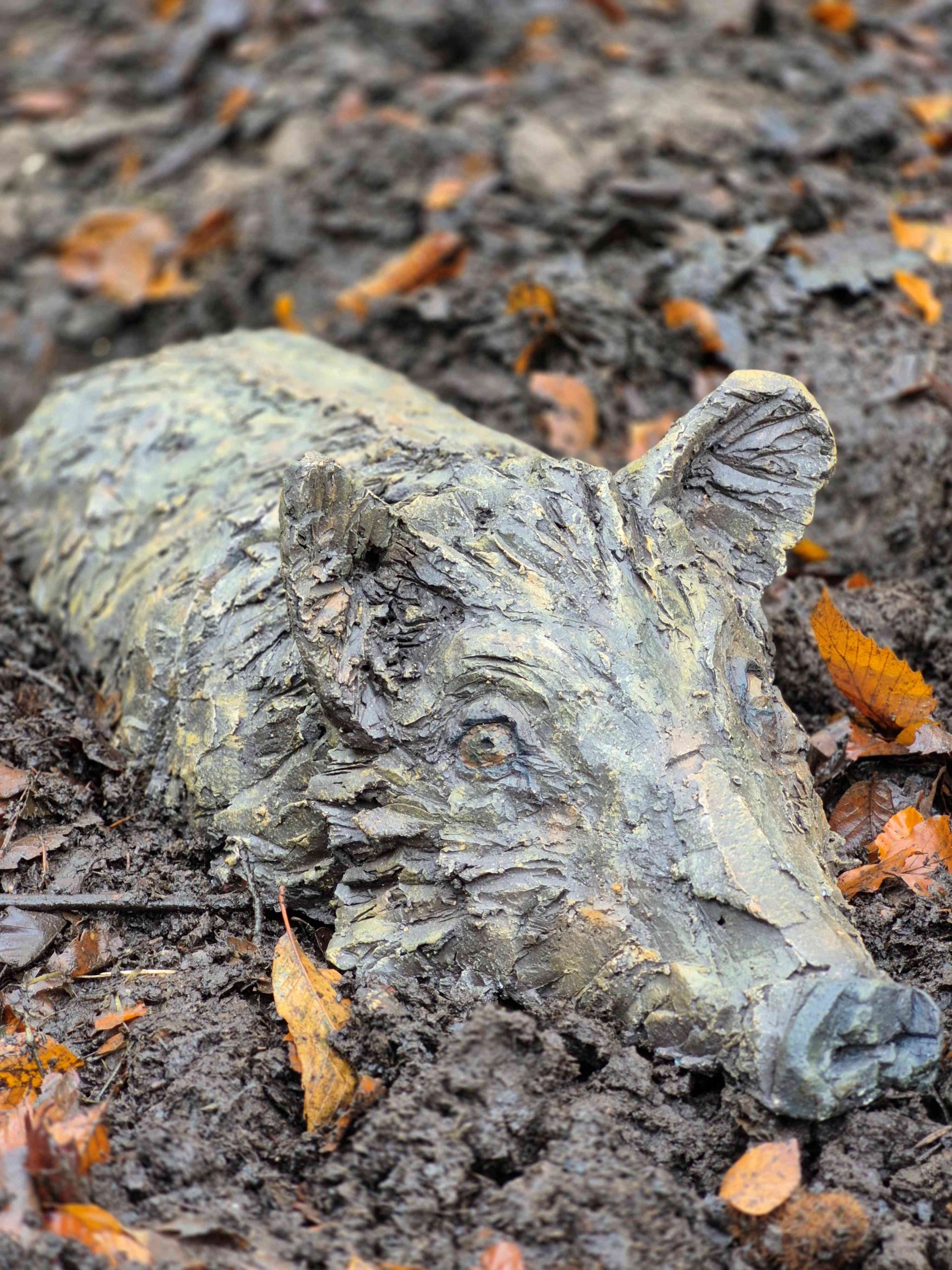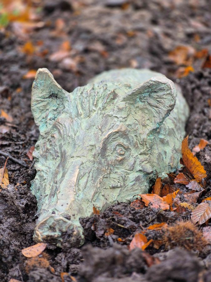 Deze bronzen versie kan dag en nacht en in weer en wind gelukzalig wroeten in de modder.