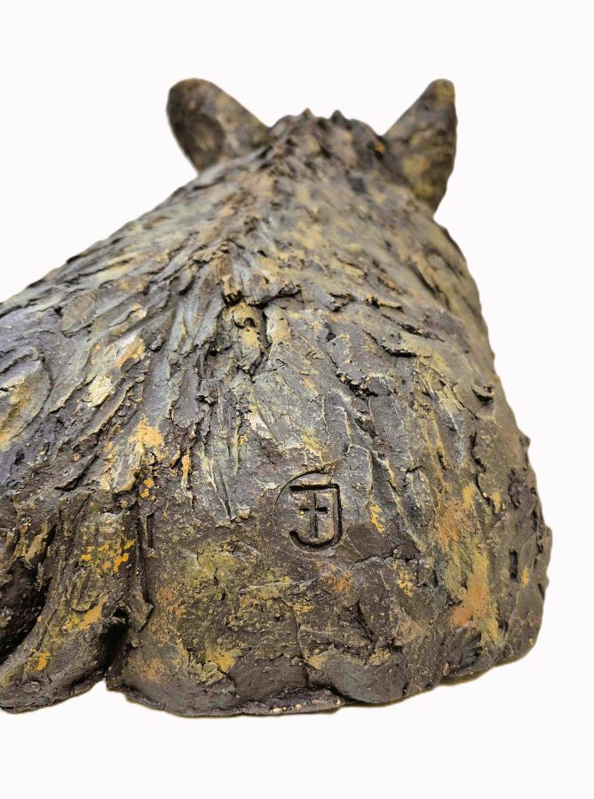 De keramieken “Blubbergeluk” met brons patine is gemaakt in twee delen.